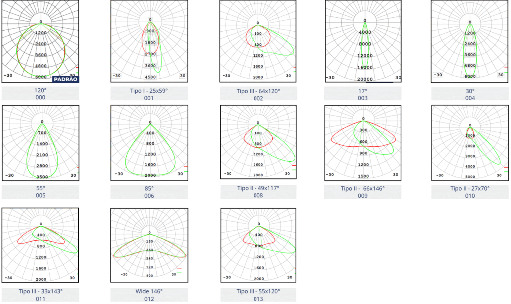 Família de produto | Potência | Tensão | TCC | Distribuição Ótica | Material Difusor | Tipo de Montagens | Opções |