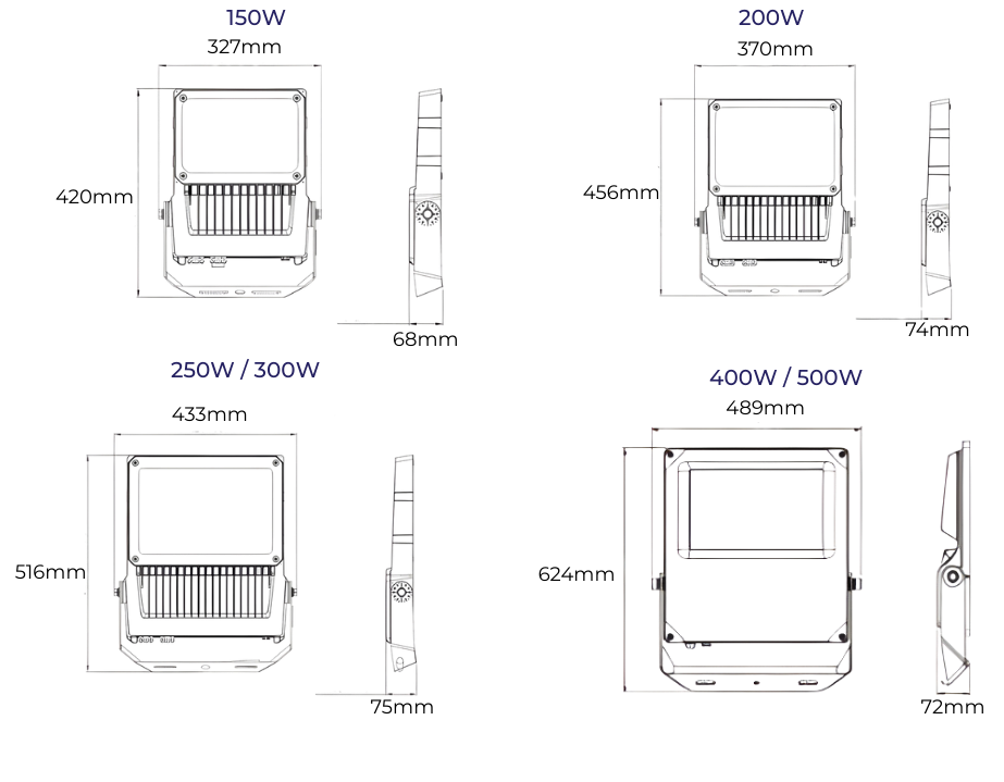 | FE-AVEX500-060-5K | 500W | 70000lm | 140 | <70 | 5000K | 60° | Vidro Transparente | 120-277Vca |